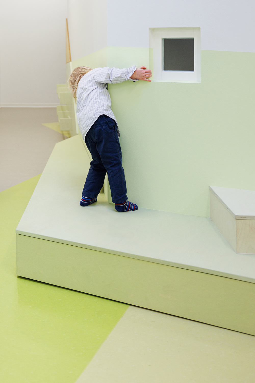 Für die Kleinsten im Kindergarten gibt es ein Spielpodest mit unterschiedlichen Oberflächen, wie Holz und Teppich. Ein Materialmix, der die taktile Wahrnehmung fördert. Mit Hilfe der abgerundeten Treppenstufen und der kleinen Rutsche können einfache Bewegungsabläufe trainiert werden. Zusätzlich lädt ein Bällebad zum Toben ein. Wenn es etwas ruhiger im Krippenraum zugehen soll, dann kann das Bällebad dank einer Klappe verschlossen werden und das Podest wird dadurch zum gemütlichen Rückzugsort.